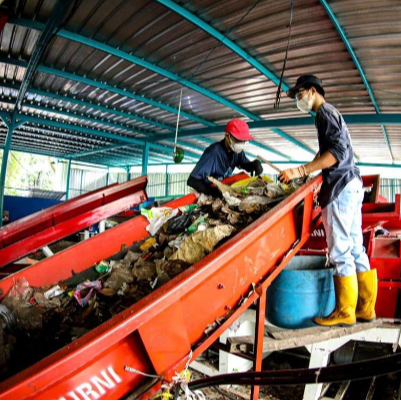 Sampah yang sudah siap dimasukkan ke lini mesin yang terdiri dari blower dan centris untuk mengeringkan sampah lebih lanjut, mesin penghancur dan pencacah.