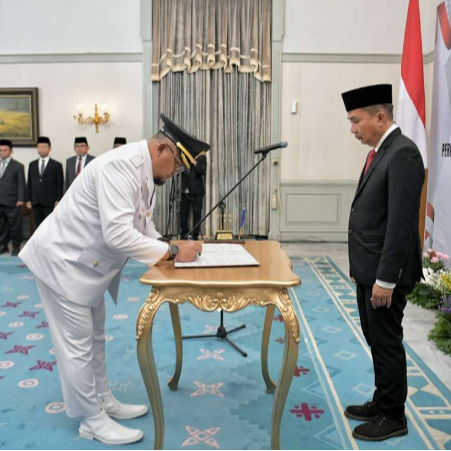 Penjabat (Pj.) Gubernur Jawa Barat Bey Machmudin melantik Soni Harison sebagai Pj. Wali Kota Banjar di Gedung Pakuan, Kota Bandung, Rabu (11/12/2024).