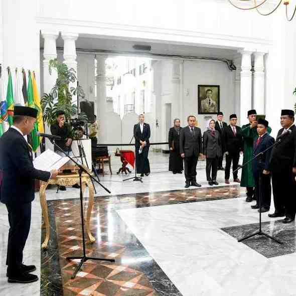 Penjabat Gubernur Jawa Barat Bey Machmudin melantik anggota Komisi Informasi Jawa Barat masa jabatan 2024 - 2028 di Gedung Sate Kota Bandung, Senin (23/12/2024)."Kepada Anggota Komisi Informasi Jawa B...